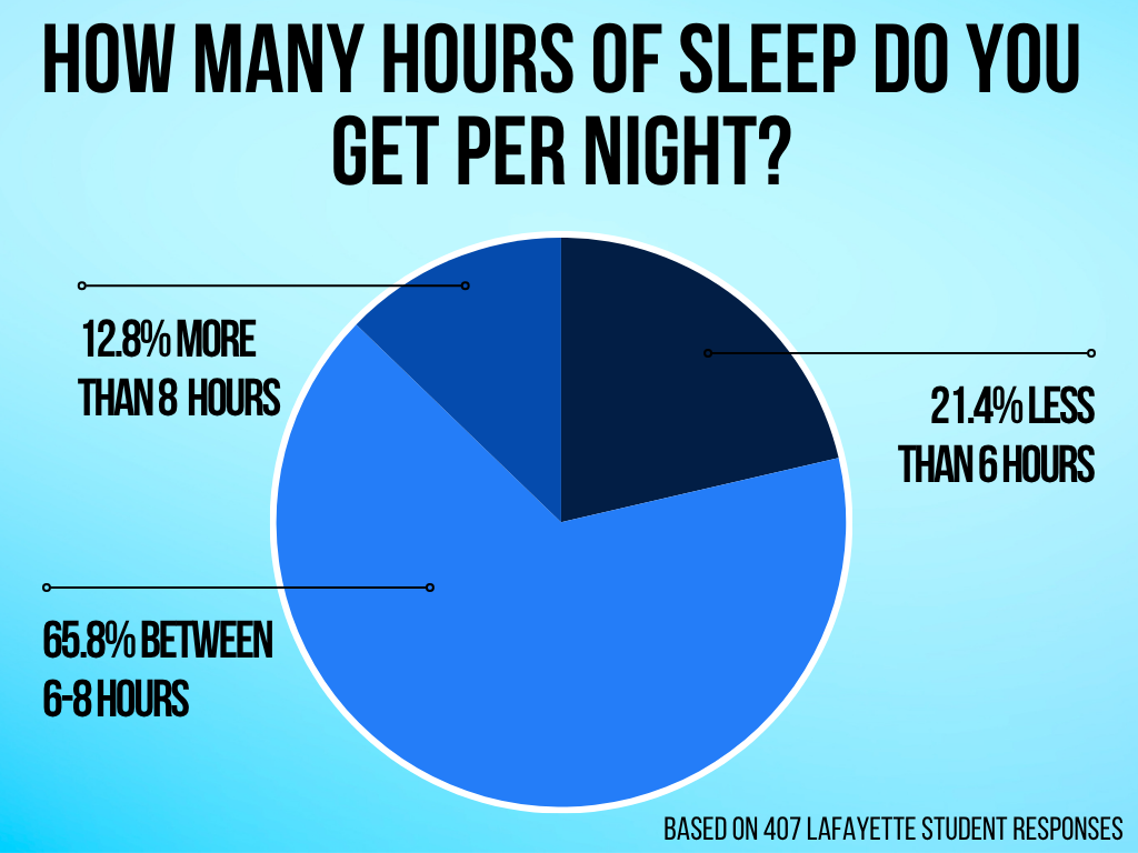 Based on a school survey here at Lafayette, over 65% of students (out of 407 students surveyed) claimed they get 6-8 hours of sleep on average and 21% receive less than 6 hours. 12% of students receive more than eight hours of sleep which is the recommended amount for adolescence. With most students getting a moderate amount, it can be inferred that the majority of students here are not meeting the recommended hours of sleep.