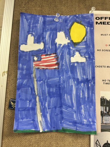 Junior Allie Meyers and freshman Luna Tucker stood facing each other as they stretched out the American flag. Tucker then carefully folded each section in the traditional order. The flag folding ceremony is a symbol of appreciation for service members, with each of the 13 folds holding a specific meaning. Once the flag was formed into a triangular “pillow,” Tucker and Meyers marched off stage, signaling the end of their performance.